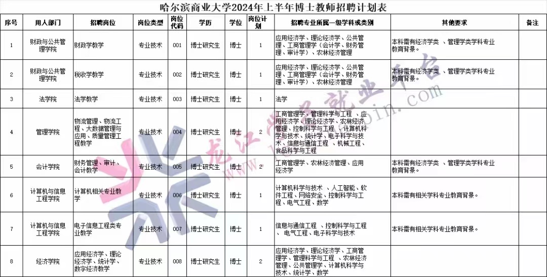 (八)各崗位的數(shù)量、專業(yè)及具體要求,詳見《哈爾濱商業(yè)大學(xué)2024年上半年博士教師招聘計(jì)劃表》(附件1)。
